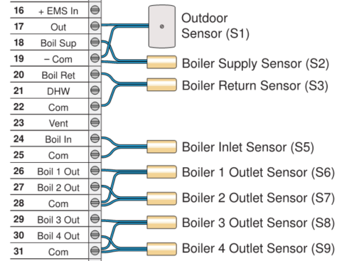 - S6 & S7 - Each boiler has a supply sensor on the outlet of the boiler. The schematic below only shows two boilers, but this can be done for up to 4 boilers.